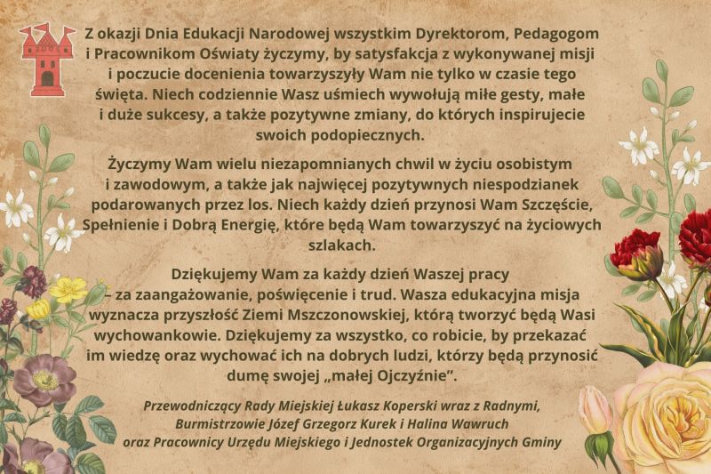 Z okazji Dnia Edukacji Narodowej wszystkim Dyrektorom, Pedagogom i Pracownikom Oświaty życzymy, by satysfakcja z wykonywanej misji i poczucie docenienia towarzyszyły Wam nie tylko w czasie tego święta.