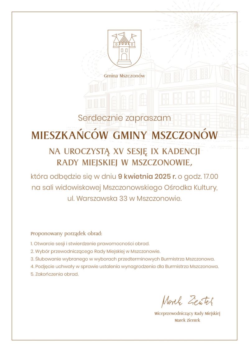 Wiceprzewodniczący Rady Miejskiej w Mszczonowie Marek Zientek serdecznie zaprasza Mieszkańców Gminy Mszczonów na uroczystą Sesję Rady Miejskiej, która odbędzie się w środę, 9 kwietnia 2025 r. o godz. 17:00 na sali widowiskowej Mszczonowskiego Ośrodka Kultury.