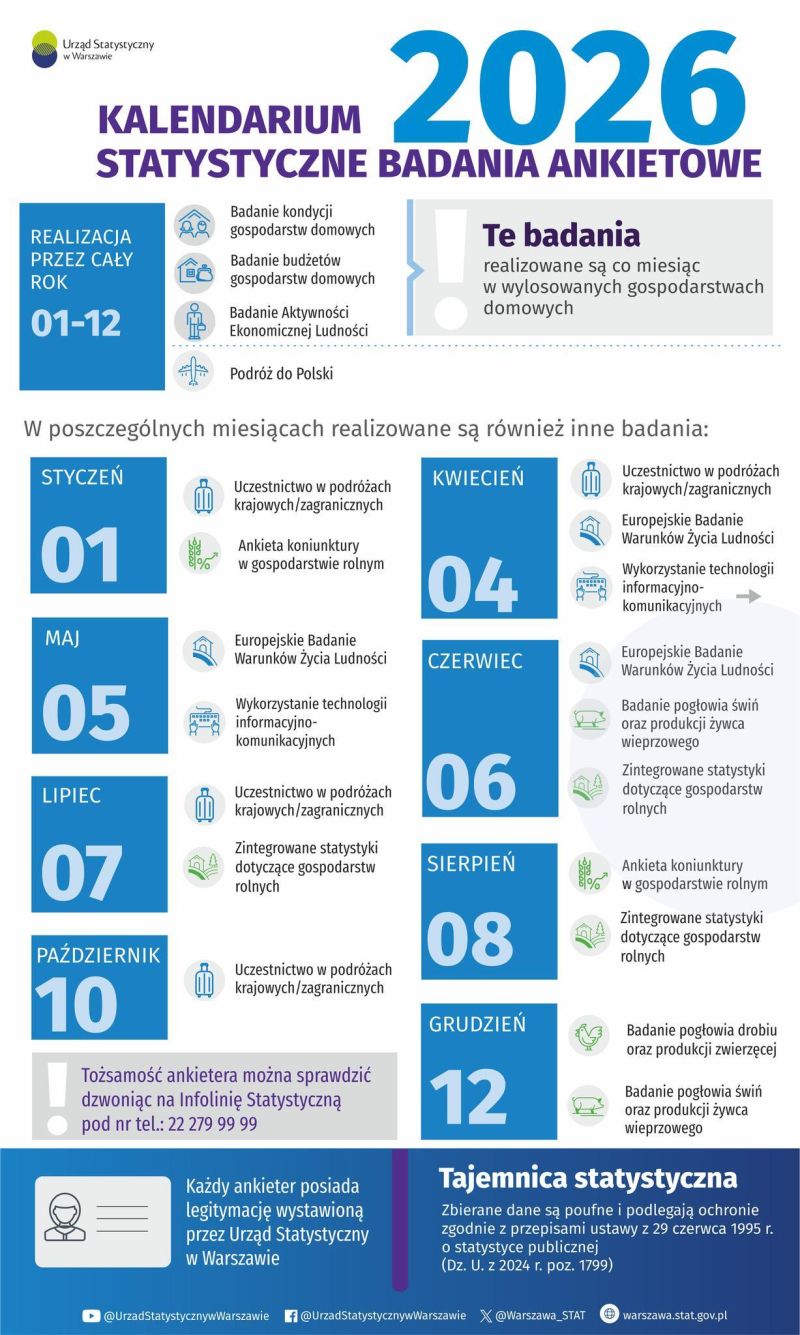 Przez cały 2026 rok wylosowane gospodarstwa domowe w Warszawie będą brały udział w regularnych badaniach prowadzonych przez Urząd Statystyczny w Warszawie. Ich celem jest lepsze poznanie warunków życia, aktywności zawodowej, budżetów domowych oraz zachowań społecznych mieszkańców.