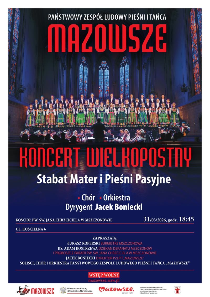 Burmistrz Mszczonowa, proboszcz Parafii pw. św. Jana Chrzciciela w Mszczonowie oraz dyrektor zespołu „Mazowsze” zapraszają na Koncert Wielkopostny w wykonaniu solistów, chóru i orkiestry.