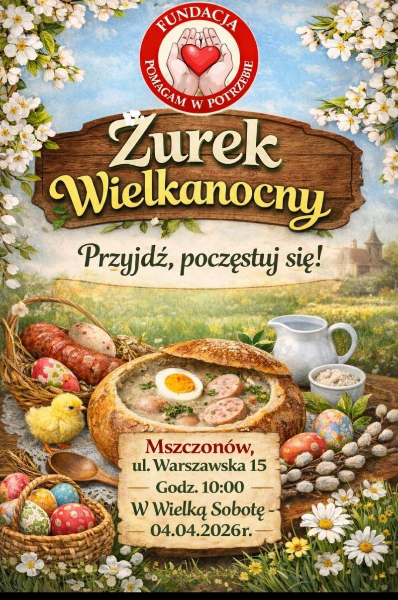 Gmina Mszczonów wraz z burmistrzem Łukaszem Koperskim dołączyła do pięknej inicjatywy Fundacji „Pomagam w potrzebie”, działającej na naszym terenie. Już w  Wielką Sobotę, 4 kwietnia w godz. 10:00-12:00, zapraszamy potrzebujących  na żurek wielkanocny, który będzie rozdawany w lokalu Całodobowej Lodówki Społecznej (Mszczonów, ul. Warszawska 15).